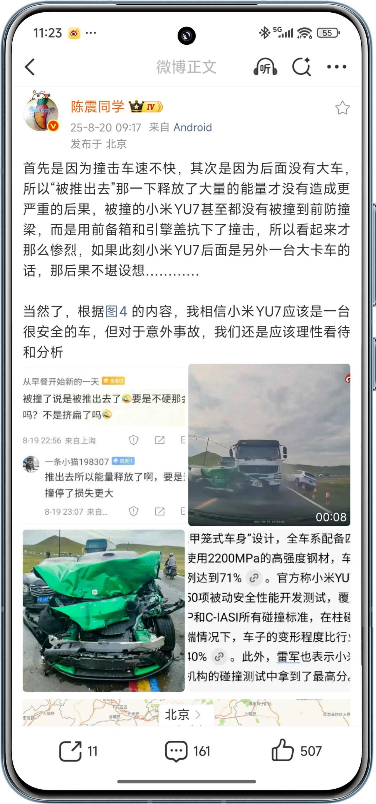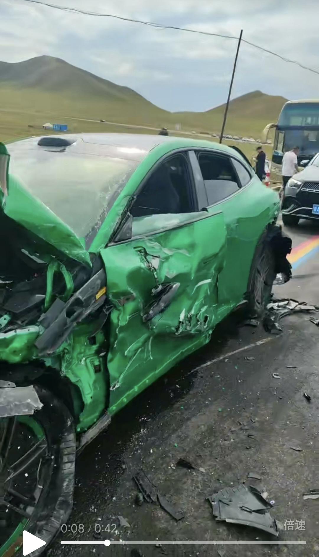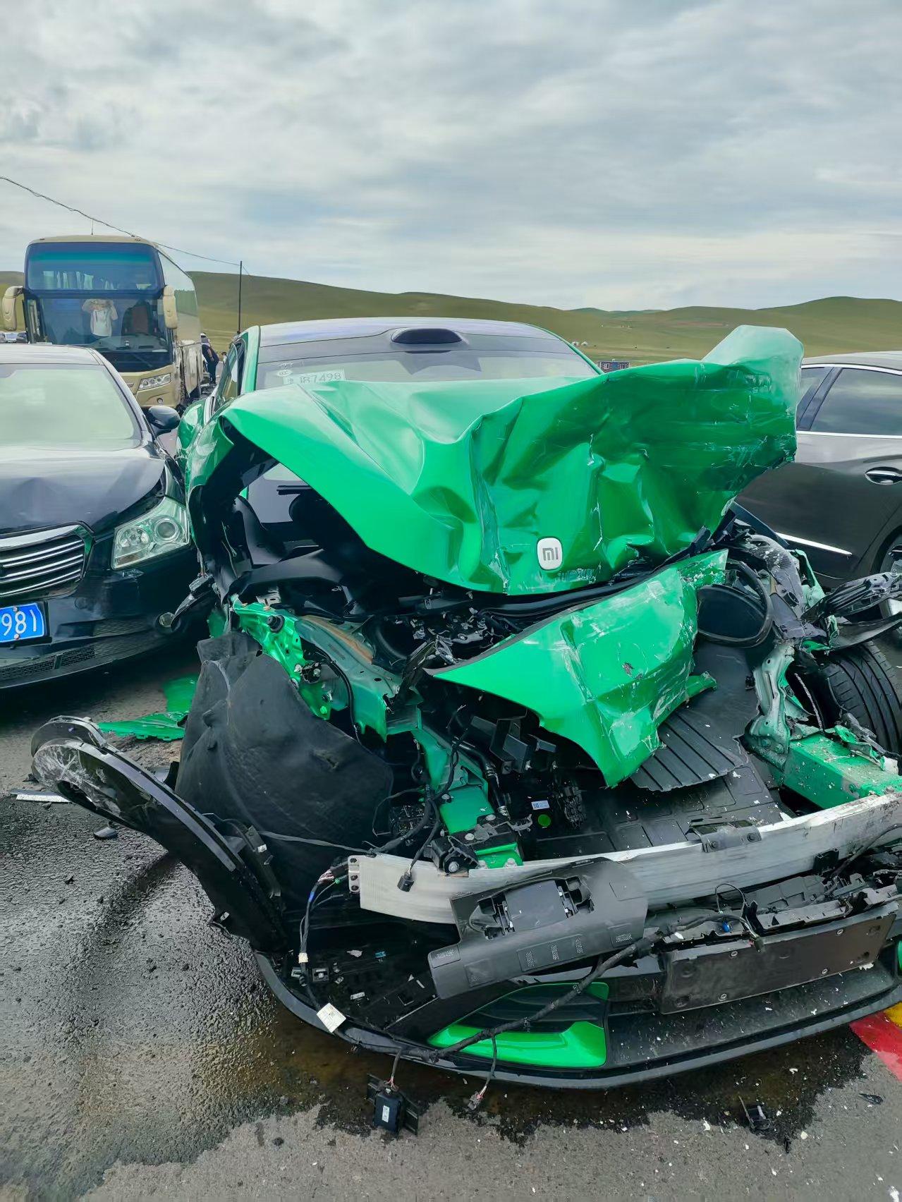 2、小米YU7被10几吨的水泥车“推出去”,A、B柱完好没变形。司机:小米这车保了我们一命。