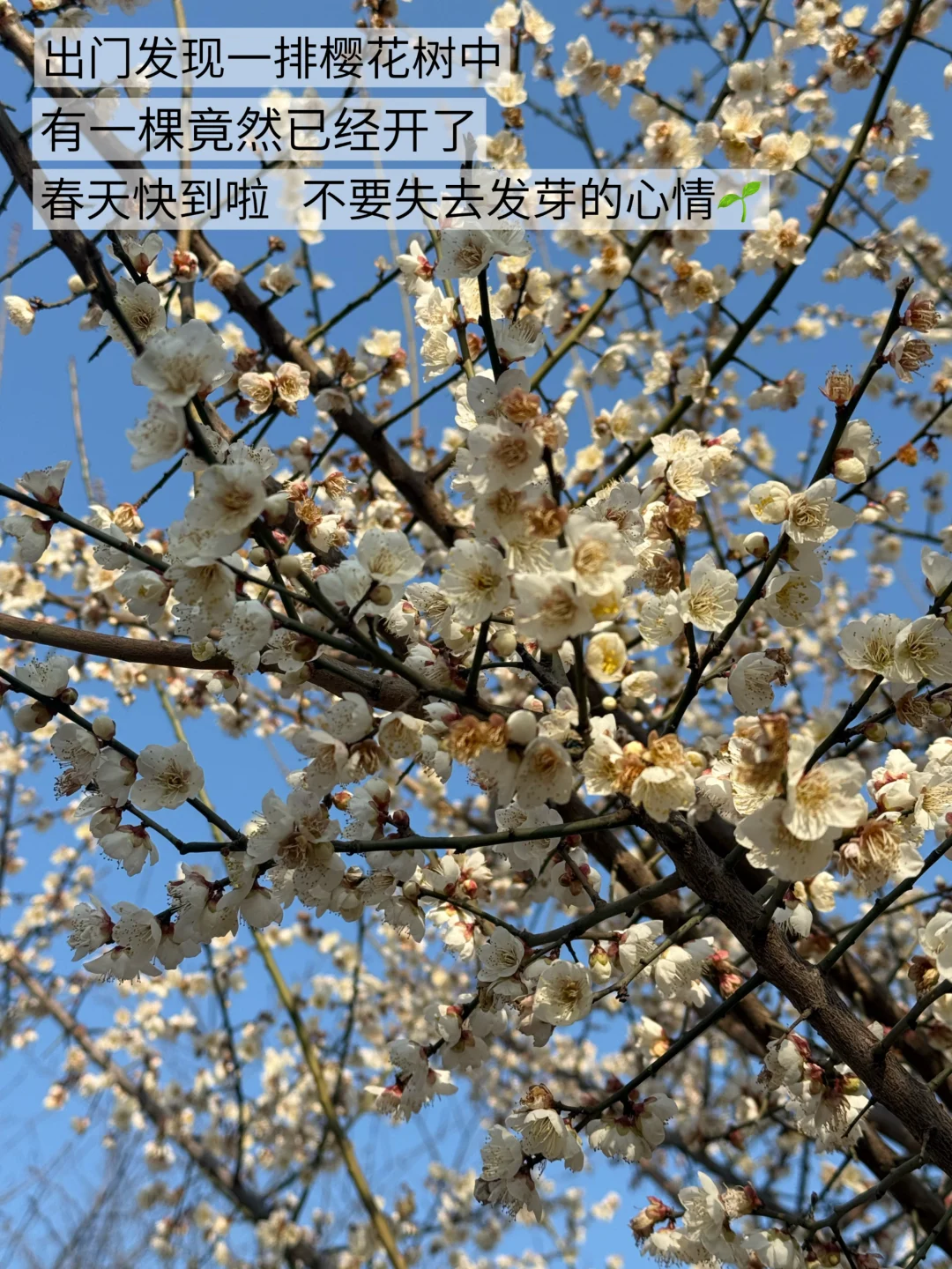 武汉的冬天还没有过去 出门发现已经有一棵樱花树开花了 春天真的快到啦 不要失去发芽的心情🌱