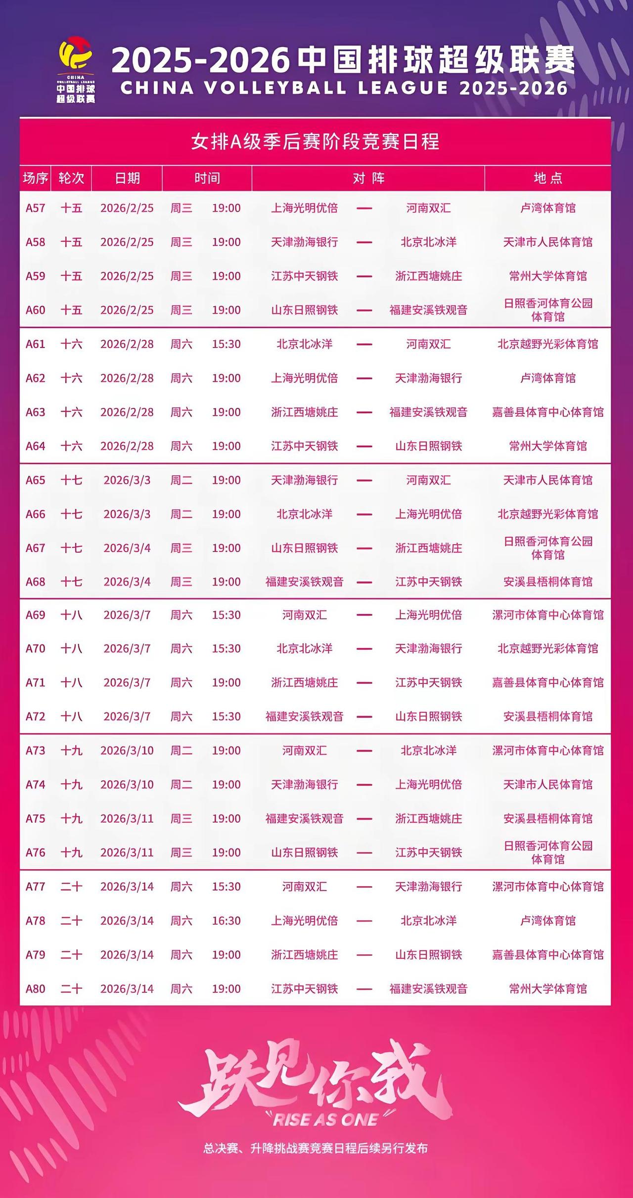 2025~2026赛季中国排球超级联赛A级季后赛将于2月25日拉开大幕! 经历常规赛14轮争夺,保定沃隶、上海光明、上海光明优倍、江苏中天钢铁能否保持状态,延续强势?经历赛中升降赛的洗礼,江苏男排、福建福清、浙江西塘姚庄、河南双汇,又能否更进一步?赛场见!A级季后赛赛程已出炉。