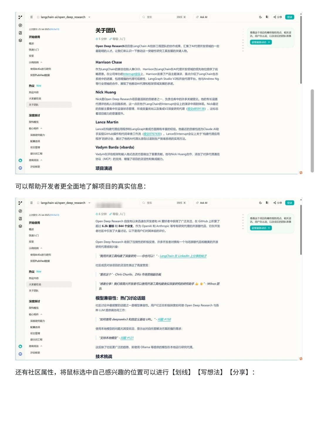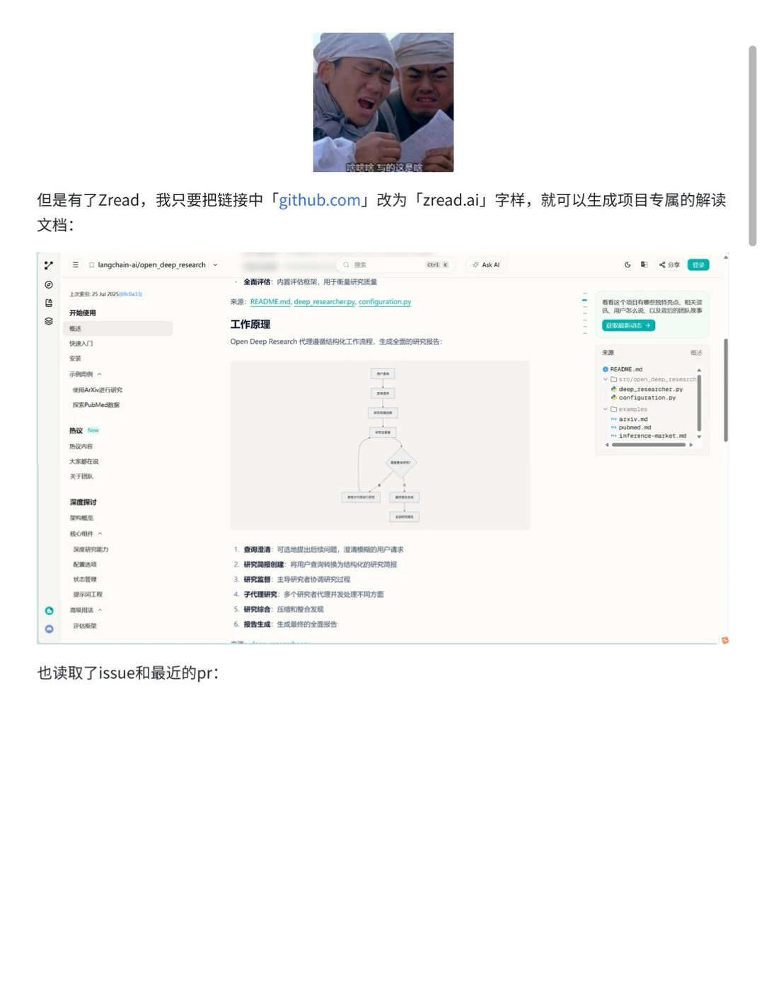 Zread 还把项目在社区里的口碑、演化脉络和背景信息一并整理,让你在短时间内建立起对一个仓库的完整认知;它背后的 Deep Research 框架以多工具链、语义检索和资料整合的方式,把“为什么好”“怎么学”“如何复刻”从模糊变清晰。