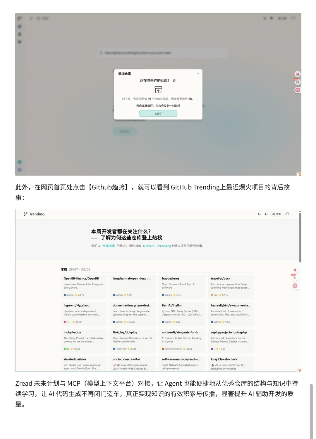 未来还计划和 MCP 打通,让下游的 Agent 能拿到有上下文的“项目理解”,不再闭门造车。上手只需把任意 GitHub 链接丢进 Zread.ai,几分钟内你能看清一个系统的核心思路,深入提问,甚至为团队构建私有的知识沉淀空间。