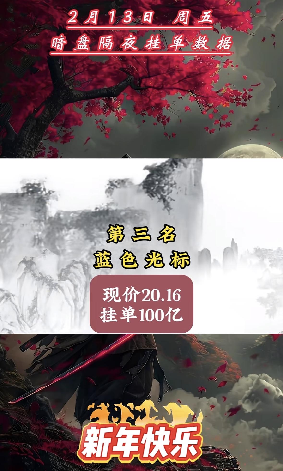 2026年2月13日暗盘隔夜单挂单前八名:第一名:博纳影业,挂单58个小目标,现