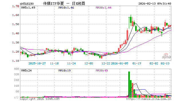 2月13日,传媒ETF华夏(516190)开盘跌1.08%,报1.470元。传媒ETF华夏(516190)重仓股方面,中国中免开盘涨0.32%,分众传媒跌0.27%,巨人网络跌0.56%,恺英网络跌0.43%,蓝色光标跌1.29%,昆仑万维跌3.19%,三七互娱跌0.69%,利欧股份跌0.88%,光线传媒涨1.31%,神州泰岳跌0.72%。