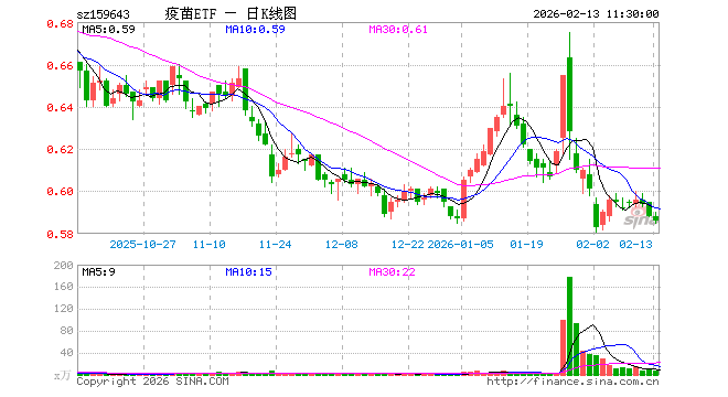 2月13日,截止午间收盘,疫苗ETF(159643)跌0.34%,报0.586元,成交额411.79万元。疫苗ETF(159643)重仓股方面,复星医药截止午盘跌0.22%,长春高新涨0.22%,智飞生物跌0.06%,沃森生物跌0.25%,万泰生物跌0.05%,华兰生物跌0.19%,昭衍新药跌3.03%,丽珠集团跌0.51%,辽宁成大跌1.00%,康泰生物跌0.53%。
