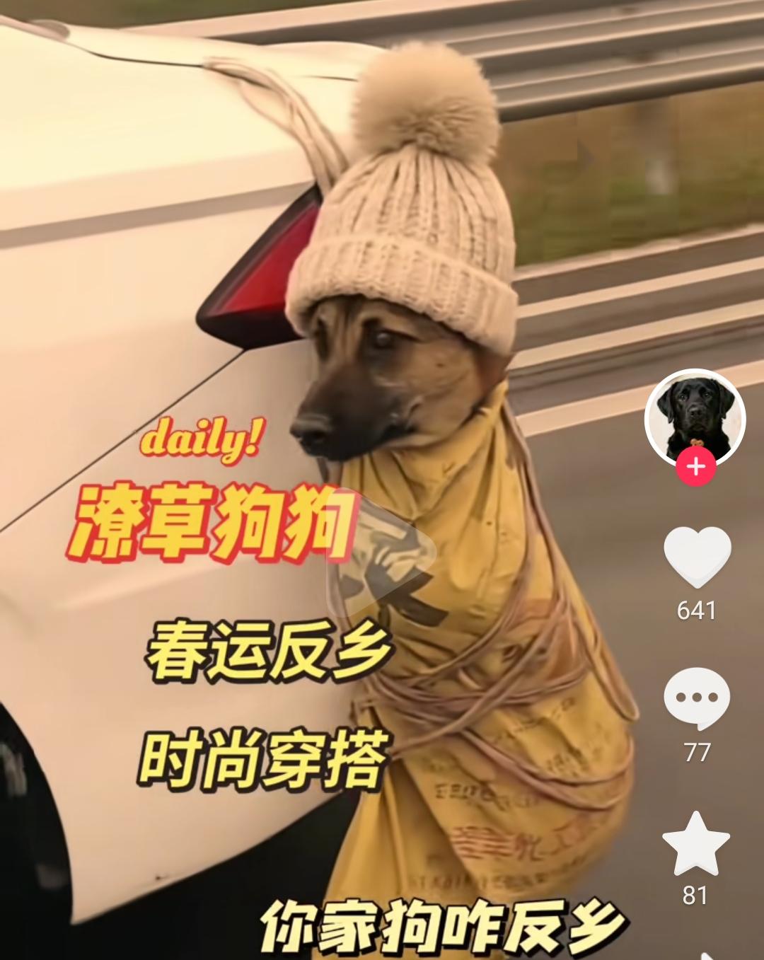 今年春运最火网红诞生了! 这只小狗凭一张“车尾挂票”,成了返乡路上最萌显眼包。 因为严重晕车待不了车厢,主人把它装进袋子挂在车尾,还特意戴了绒帽防风保暖,小脑袋一脸懵圈不知所措,画面又好笑又暖心。 春运团圆路,多少宠物被狠心留守或丢弃,而这位主人哪怕想了个最接地气的办法,也执意带毛孩子一起回家。春运小狗 车尾小狗 春运版狗