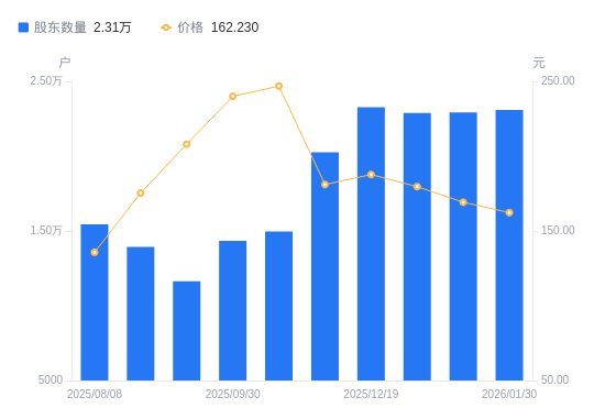 日期A股户数(户)流通A股户均持股数(股)户均持股市值(万元)2026-01-30230962060.9933.442026-01-20229162077.1835.152026-01-09228862079.9037.362025-12-19232652046.0238.402025-11-28202492350.7742.562025-10-10149713179.5278.492025-09-30143473317.8179.632025-08-29116324092.2285.122025-08-20139363415.6659.892025-08-08154503080.9541.81
