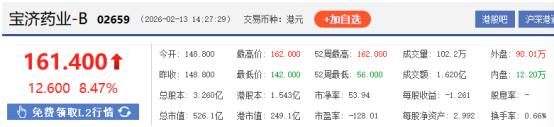 上证报中国证券网讯(记者杨子晏)2月13日午后,宝济药业-B涨幅进一步扩大,最高价报162港元/股,股价再创新高。截至14时27分,宝济药业-B报161.4港元/股,涨8.47%,总市值约526.1亿港元。Choice数据显示,近6个交易日内,宝济药业-B累计涨幅近65%。