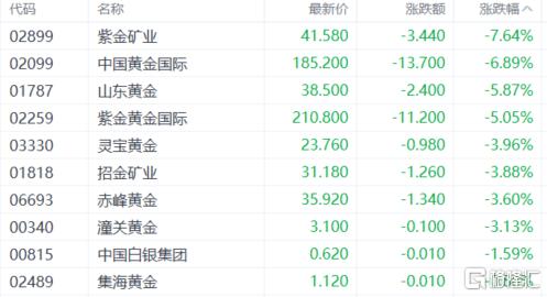 黄金概念股集体走低,紫金矿业跌超7%,中国黄金国际、山东黄金、紫金黄金国际、灵宝黄金、招金矿业、赤峰黄金等跟跌。