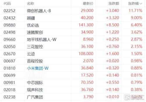 机器人概念股上扬,微创机器人涨超11%,越疆、优必选、速腾聚创、地平线机器人、三花智控、云迹等跟涨。