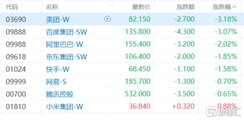 权重科技股多数下跌,美团、百度跌超3%,阿里巴巴跌超2%,京东、快手、网易、腾讯控股跟跌,小米微涨。