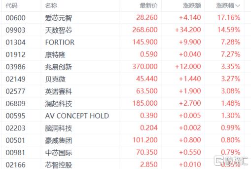 半导体股强势,爱芯元智涨超17%,天数智芯、兆易创新、贝克微、英诺赛科、澜起科技等跟涨。