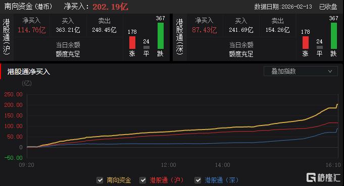 今日,南向资金净买入202.19亿港元,其中港股通(沪)净买入114.76亿港元,港股通(深)净买入87.43亿港元。