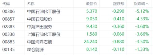 石油股下挫,中国石油化工股份跌超5%,中国石油股份、中海油田服务、上海石油化工股份、中国海洋石油等跟跌。