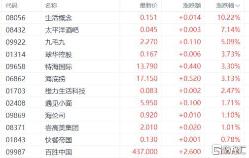 餐饮股活跃,九毛九涨超5%,翠华控股、特海国际、海底捞、遇见小面等跟涨。