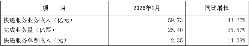 2月13日,申通快递(002468)发布公告,2026年1月经营简报显示,公司快递服务业务收入为59.73亿元,同比增长43.26%。