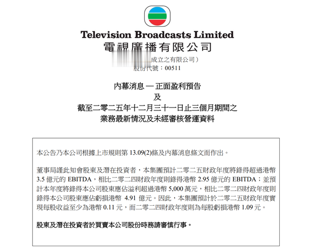 近日,电视广播有限公司(简称:电视广播;英文简称:TVB;000511.HK)发布业绩盈利预告,预计2025财年盈利超过5000万港元,同比扭亏为盈,2024年财年公司亏损4.91亿港元。公司预计2025财年EBITDA(息税折旧及摊销前利润)超3.5亿港元,2024财年为2.95亿港元;实现每股收益至少0.11港元,2024年财年每股亏损1.09港元。