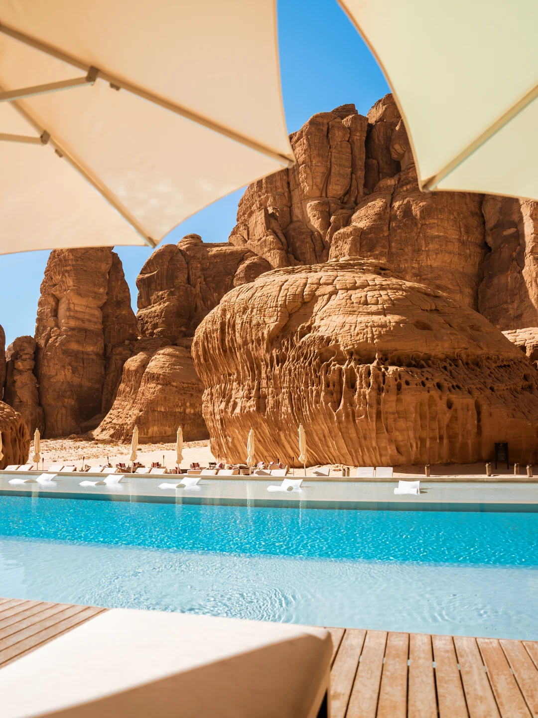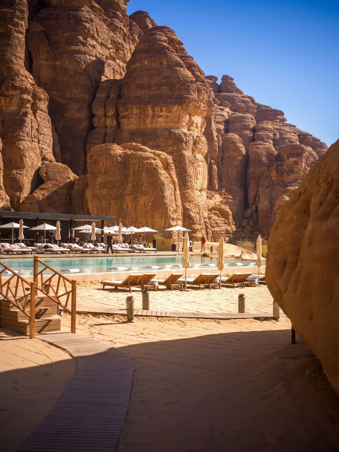 不得不说Alula的酒店实在太迷人了,泳池、沙漠、蹦床、岩石电影,应有尽有……
