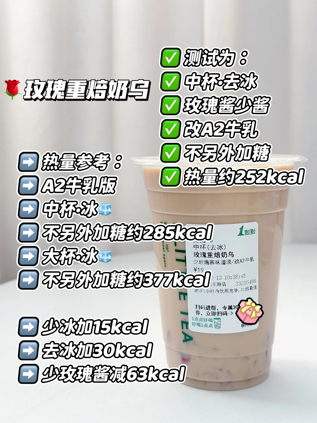 测试为:中杯·去冰 改A2牛乳 不另外加糖 少玫瑰酱 热量约252kcal