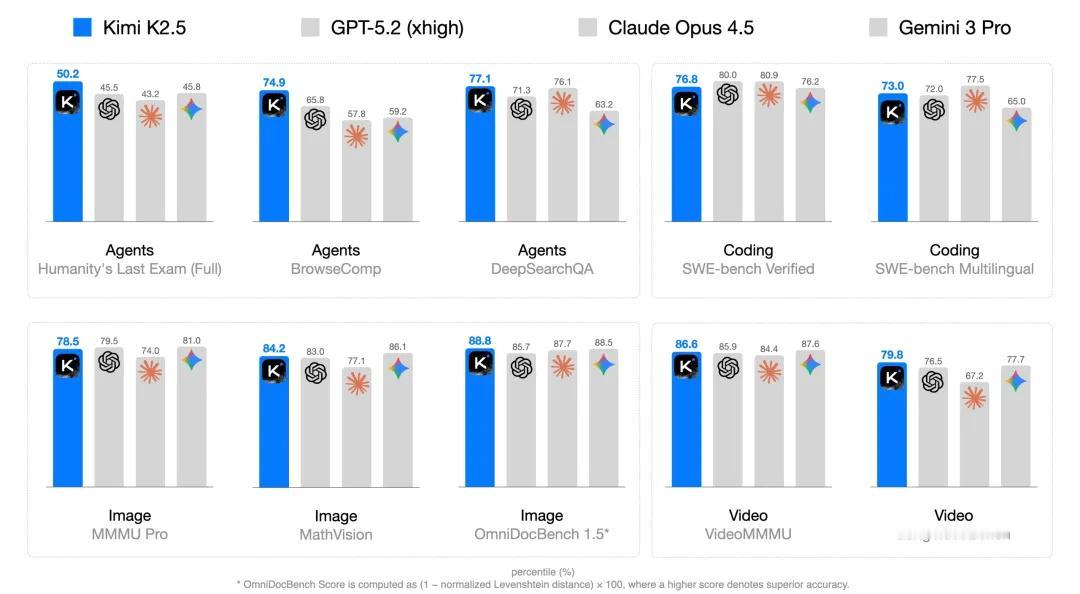 Kimi 官方发布了 Kimi K2.5 技术报告, 介绍了 Kimi K2.5 如何实现文本和视觉能力互相增强,希望帮助更多感兴趣的人了解模型背后的技术。 下面是 Kimi K2.5 实现文本和视觉能力互相增强的核心原理,包括以下几个方面: 1. 联合文本-视觉预训练: 早期视觉融合:在预训练阶段,K2.5 采用早期视觉融合策略,在训练早期就引入视觉数据,并保持恒定比例混合文本和视觉 token,使模型能够自然地发展出平衡的多模态表征。 MoonViT-3D:K2.5 采用 MoonViT-3D 作为视觉编码器,支持可变分辨率图像输入,并通过 NaViT 打包策略将图像划分为 patch 并顺序拼接成 1D 序列,从而能够高效地处理不同分辨率的图像和视频。 2. Zero-Vision SFT: 零视觉激活:K2.5 通过零视觉监督微调(Zero-Vision SFT)技术,仅使用文本数据即可激活视觉能力,避免了传统方法中需要人工标注或提示工程生成视觉数据的局限性。 3. 联合多模态强化学习: 基于结果回报的视觉强化学习:K2.5 在视觉定位与计数、图表与文档理解、视觉关键型 STEM 问题等任务上采用基于结果回报的视觉强化学习,进一步提升视觉能力。 视觉强化学习提升文本性能:研究发现,视觉强化学习不仅可以提升视觉能力,还可以在文本任务上产生可测量的改进,实现了文本和视觉能力的双向增强。 4. Agent 集群: 并行执行:Agent 集群允许模型将复杂任务分解为异构子问题,并由领域专门化的 agent 并发执行,从而实现并行化,进一步提升模型在多个领域的性能。 详细报告可以搜索一下