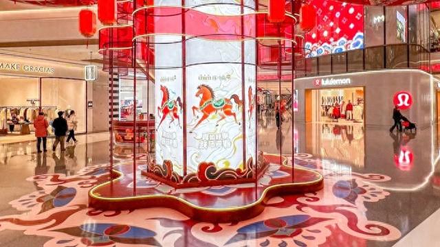围绕“真如好事跃马迎春”新春主题,中海真如环宇城MAX商场特别呈现“跃马迎春”主题艺术美陈。商场中庭宫灯高度约8米,采用多层镂空工艺搭建,灯体主视觉撷取壁画飞天、祥云经典纹样,搭配鎏金、朱红、暖橙传统色系,尽显典雅大气。灯体四面绘有灵动跃马图案,周身悬垂数十盏精致小红灯,与顶部延展的红色绸带交相辉映,灯影摇曳、绸带翩飞,新春氛围感十足。美陈底部铺设呼应纹样的祥云地贴,自宫灯基座向四周铺展,形成“祥云托灯”的视觉效果,与商场挑高空间相得益彰、意境十足。