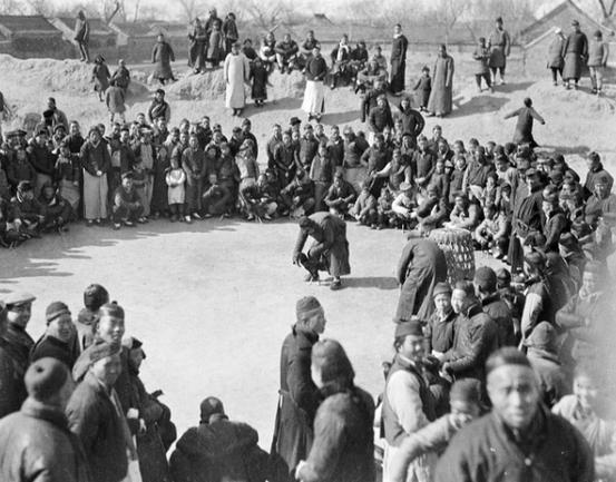 1917年,河南开封,一场民间斗鸡盛景,是百年前中国市井生活的鲜活切片。场地中央,两名男子正俯身忙碌,他们是斗鸡的主人,正准备将各自的公鸡放入圈内一决高下。旁边的竹编鸡笼清晰可见,笼中蓄势待发的公鸡,是这场较量的主角。 画面中心是一片开阔的土场,被里三层外三层的人群围成天然“斗场”。冬日的寒风里,男女老少或蹲或站,神情专注地望向场心,连远处土坡上也挤满了围观者,足见这项活动在当地的号召力。