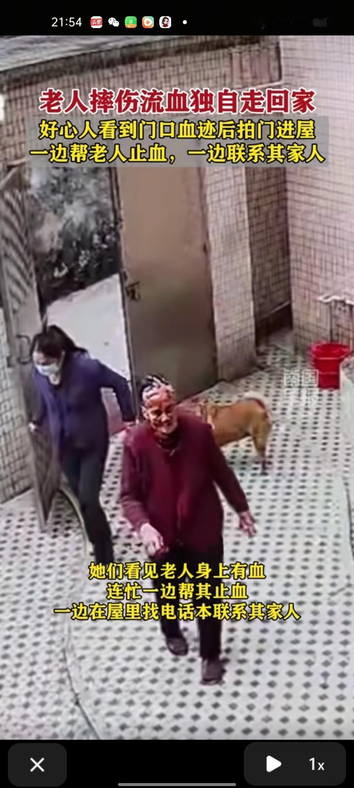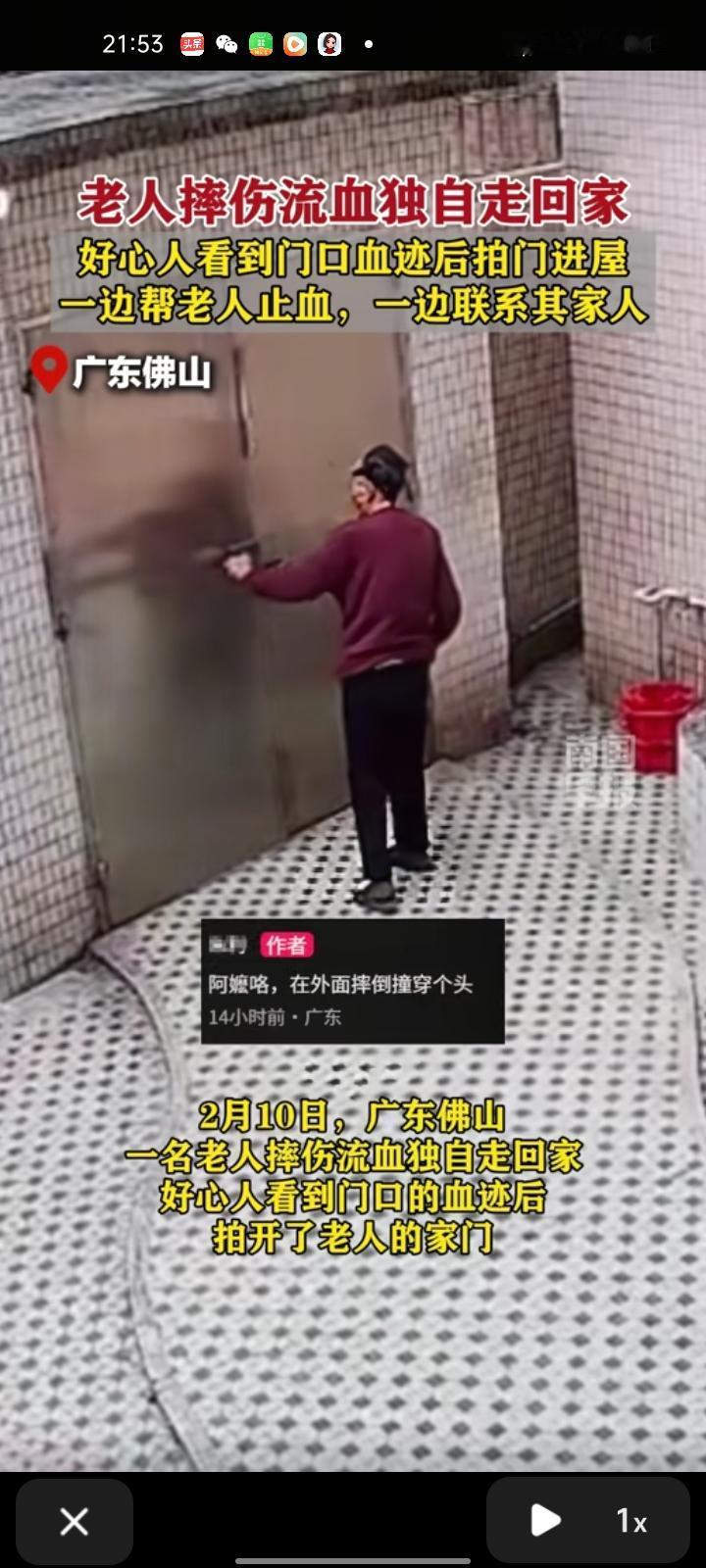 2月10日,广东佛山。一老人摔伤流血独自走回家,好心人看到门口的血迹后,拍开了老人的家门。他们看见老人身上流血,连忙一遍帮其止血,一边在屋里找电话本联系家人,最终老人的家人及时赶回,将其送往医院。 13日,老人家属称,真的非常感谢他们毫不犹豫的帮助!