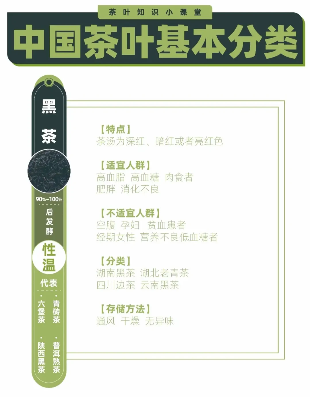 黑茶(后发酵):如普洱熟茶、安化黑茶,耐储存,滋味醇厚。