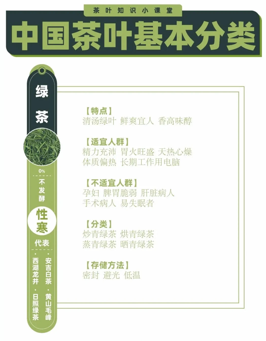 绿茶(不发酵):如龙井、碧螺春,清香鲜爽,保留天然物质。