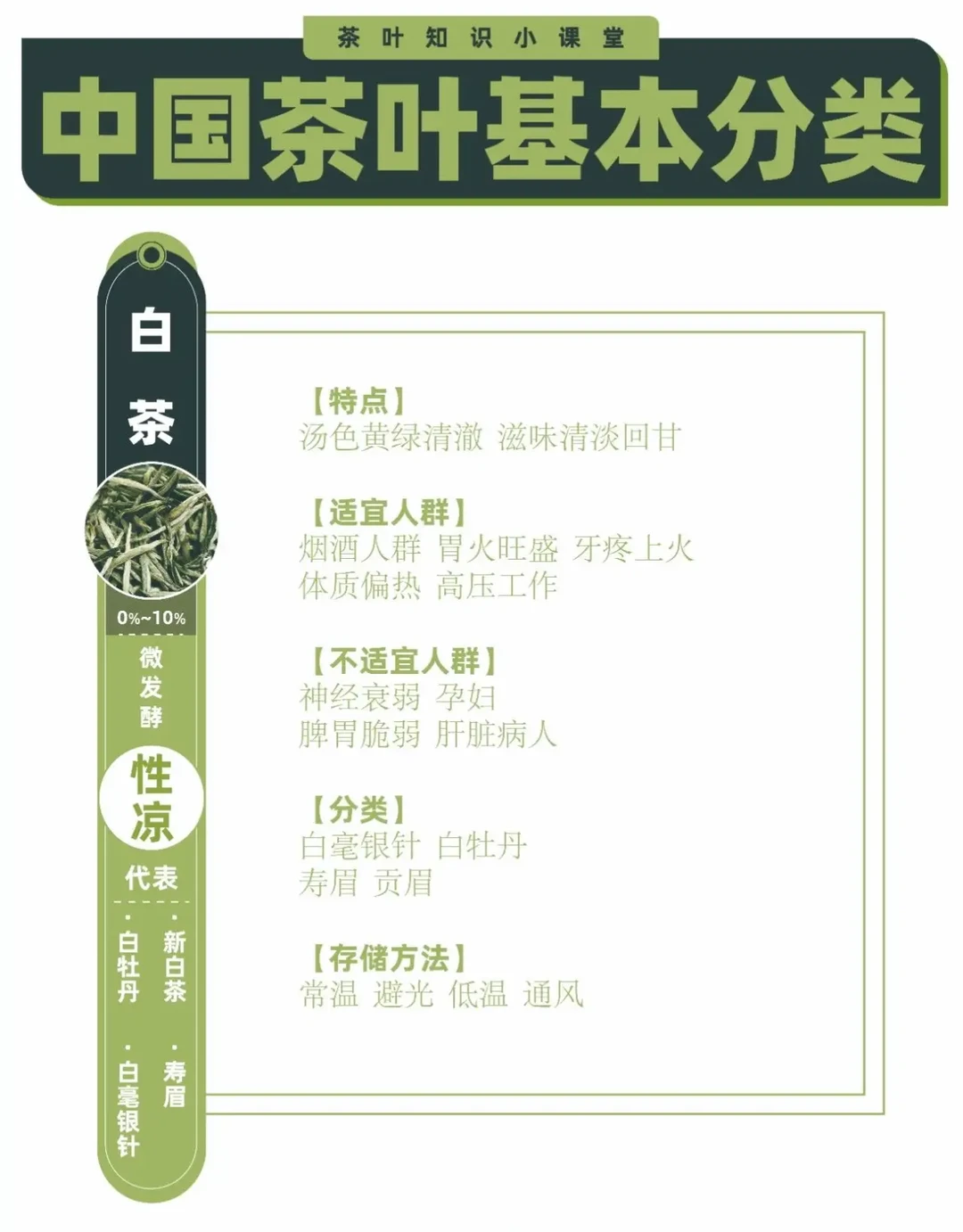 白茶(轻微发酵):如白毫银针、寿眉,自然萎凋,滋味清雅。