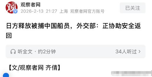 中国船长已获释,日本海保警告日本渔民避免去钓鱼岛。 2月13日晚,一张释放令终结了那场持续不到48小时的喧嚣,那位47岁的中国船长在缴纳了保证金后,走出了扣押点。 他的身后,是日本农林水产大臣铃木宪和与防卫大臣木原稔的高调广播,麦克风前的声浪几乎要掀翻屋顶:“严厉查处”、“彻底遏制非法捕鱼”、“保卫日本权益”。 然而就在东京的聚光灯把“强硬”二字打在公屏上的同一时刻,在那里的日本海保第十一管区,官员们正低调地敲开冲绳渔协的大门,递过去的话术不再是“保卫权益”,而是一句近乎恳求的内部指令:“请尽量不要去钓鱼岛。” 这一幕简直是绝妙的黑色幽默:左手在长崎外海抓人,右手在钓鱼岛海域赶人,赶的还是自己人。 抓捕中国船长,是一场演给永田町看的“政治歌舞伎”,自从极右翼势力在日本众议院占据上风后,无论是铃木还是木原,都需要用一场具体的“执法秀”来安抚国内躁动的民族情绪。 他们太需要这个名为“非法捕鱼”的抓手了,既能试探中方的外交底线,又能试图通过制造摩擦,逼迫中方打破冷淡,强行开启对话。 但在距离权力中心遥远的冲绳,海保官员们的脊梁骨却感到一阵恶寒,他们很清楚,政客嘴里的“强硬”是选票的助燃剂,而在大海上,这种“强硬”可能变成引发战火的雷管。 这股寒意的源头,得追溯到高市早苗那句“台湾有事就是日本存亡危机”,这位政客的疯言疯语,在去年11月点燃了中日关系的引信,却让一线的执行者们如坐针毡。 石垣市长中山义隆把话说得很透:“万一真有人被扣,就会变成巨大的国际事件。”海保官员心知肚明,一旦日本渔民在钓鱼岛被中方“对等反制”,那将是日本政府无法承受的外交噩梦。 所以前阁僚片山皋月才会私下找到渔民,抛开所有官面文章,直白地警告:“小事情也可能引发战争。” 为了规避这种风险,日本政府选择了一种最尴尬的战术:自我阉割,与其等着被中国海警抓,不如先把自己的渔民锁在港口里,这一策略的效果,诚实地反映在一组冷冰冰的数据曲线上,它比任何外交辞令都更具说服力。 回望1978年,那时候日本渔船在钓鱼岛海域的活动频次高达164次,那是一个他们还能在海上自由驰骋的年代。 到了2024年,这个数字断崖式下跌到了18次,而刚刚过去的2025年,数据已经从个位数跌到了地板上,仅仅剩下8次。 这不仅仅是行政劝阻的结果,海面上,中国海警船的轮廓已经成了常态化的背景板,连续91天的在场记录,就像一道移动的钢铁长城,硬生生把这片海域变成了日本渔船的“禁区”。 日方媒体特意放大的“两艘中国船只配备机枪”的细节,与其说是在渲染威胁,不如说是在为自己的退缩寻找体面的借口。 法律的边界最终是由实力来丈量的,尽管日本海保在那霸嘴硬地宣称只是“保持必要沟通”,但现实是,他们已经默认了无法为本国渔民提供保护的事实。 这是一记回旋镖的完美闭环,当初高市早苗们试图在台海问题上煽风点火,妄图把钓鱼岛作为地缘博弈的筹码,结果火星溅回来,不仅没能烧到对手,反而把自己在钓鱼岛的实际控制权烧了个精光。 当外交部发言人林剑在记者会上淡定回应船长回国的消息时,那种从容与日方“偷偷摸摸劝退渔民”的窘态,构成了2026年初最讽刺的画面。 历史不会说谎,数据更不会,那个日本渔民视钓鱼岛为自家后院的时代,已经伴随着那张不断归零的航行表,彻底沉入了太平洋的海底。