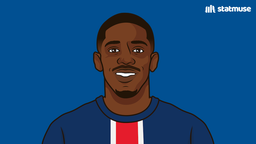 自上赛季法甲开始以来,登贝莱有27次首发,参与39个进球