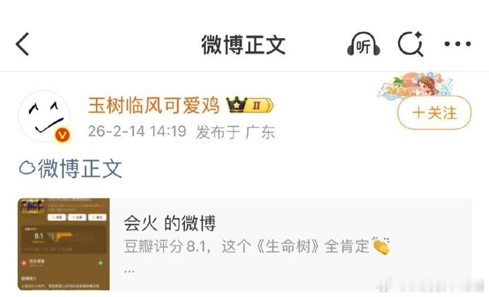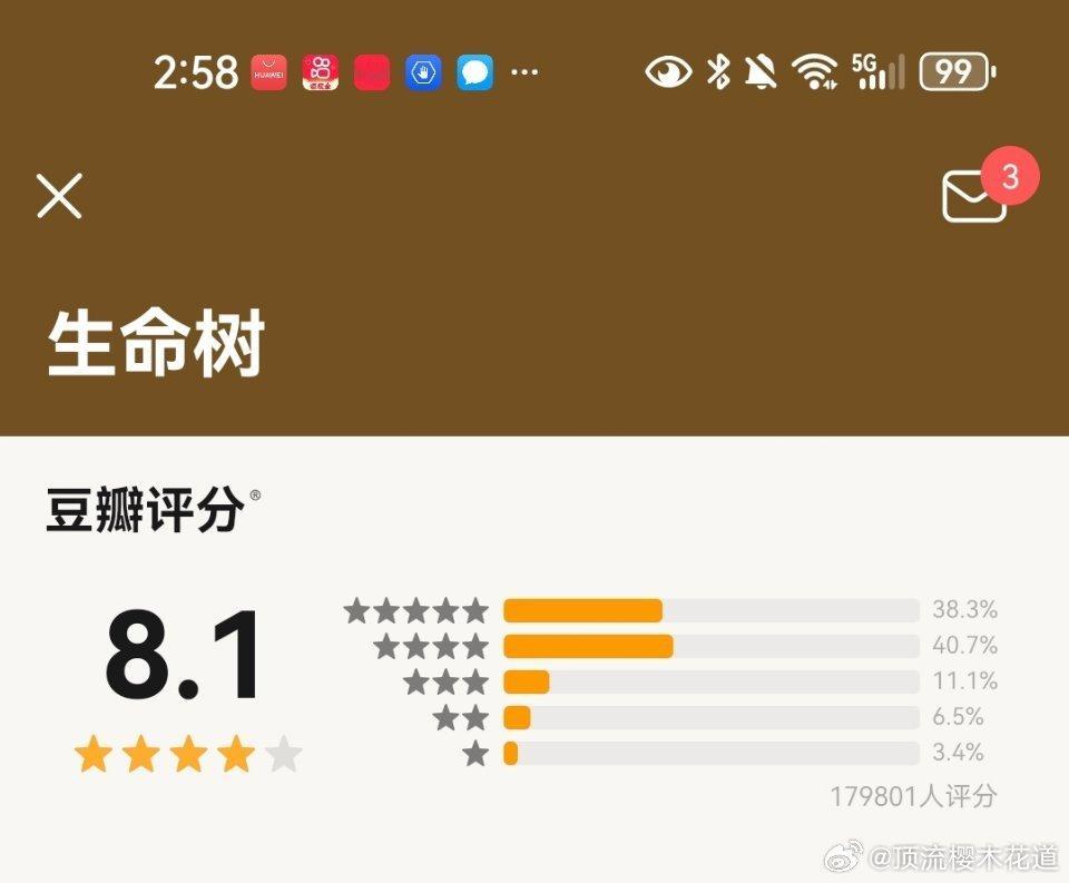 生命树豆瓣开分8.1生命树刚开分,有明星红V大粉又在号召给生命树打低分。目前生命树豆瓣又涌入了大量一星,粉圈争斗何时才能放过这些优秀的作品?自己偶像主演的剧集连续扑街导致粉圈内部群体性失望至极面临崩塌,通过仇视别家作品真的能够转移粉丝群体内部矛盾吗?难道不是应该督促自己的偶像提高业务水平,争取早日有代表作吗?