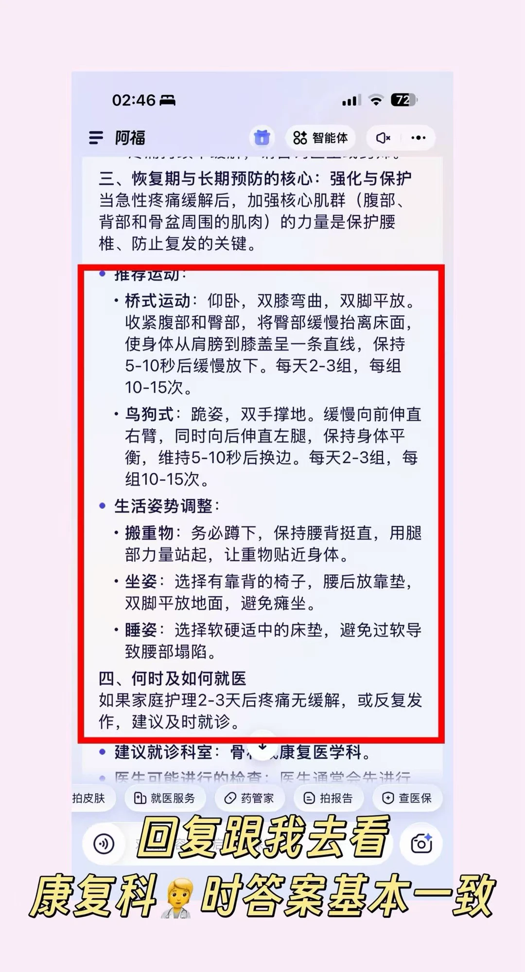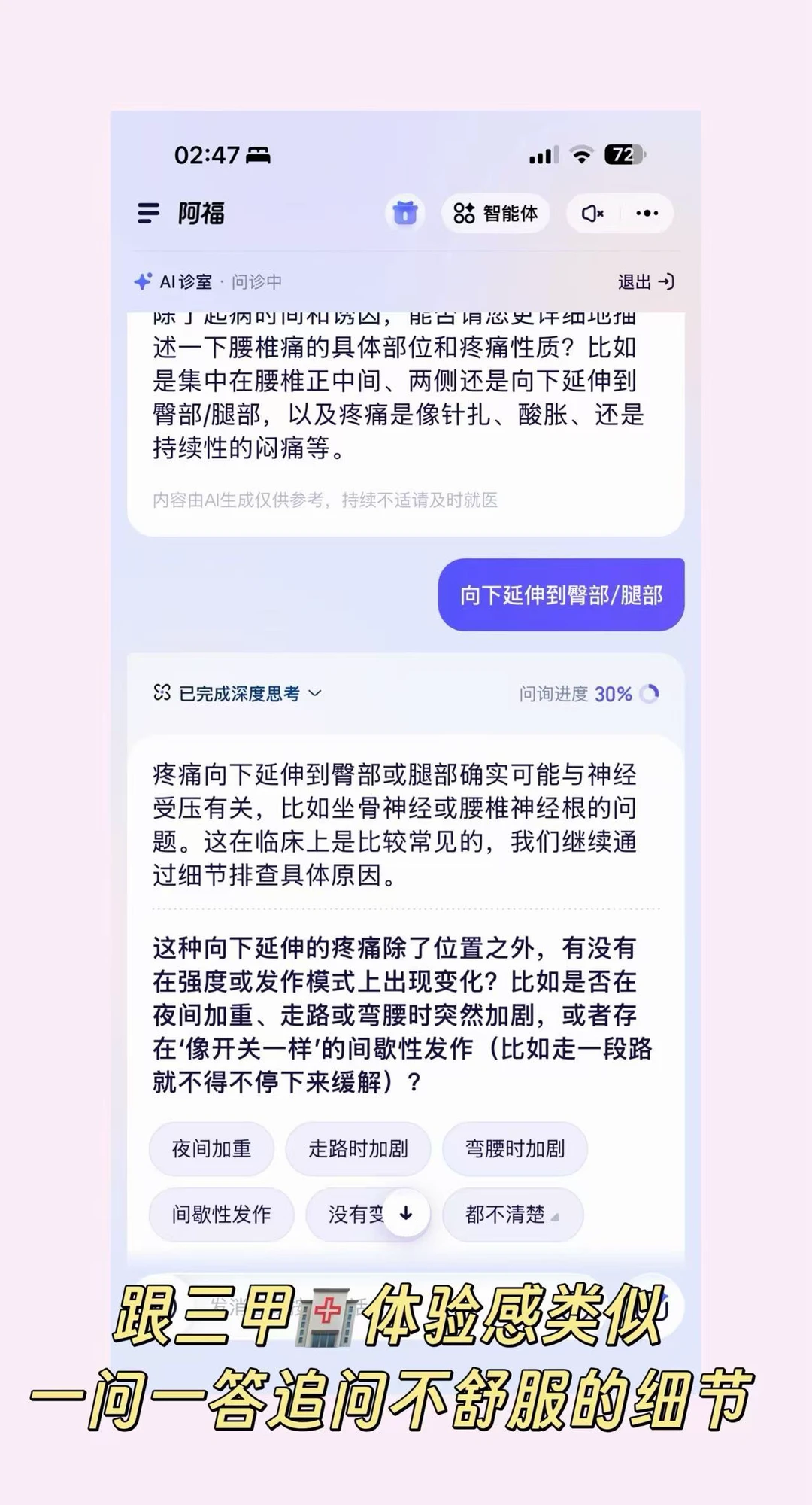 它是6位院士和1000多位名医共同训练出来的专业健康AI。我问腰椎问题,它不会只说“注意休息”,而是会结合久坐时间、运动习惯来追问,再给针对性缓解建议,最终的回答也真的和去🏥问👨⚕️说得差不多。