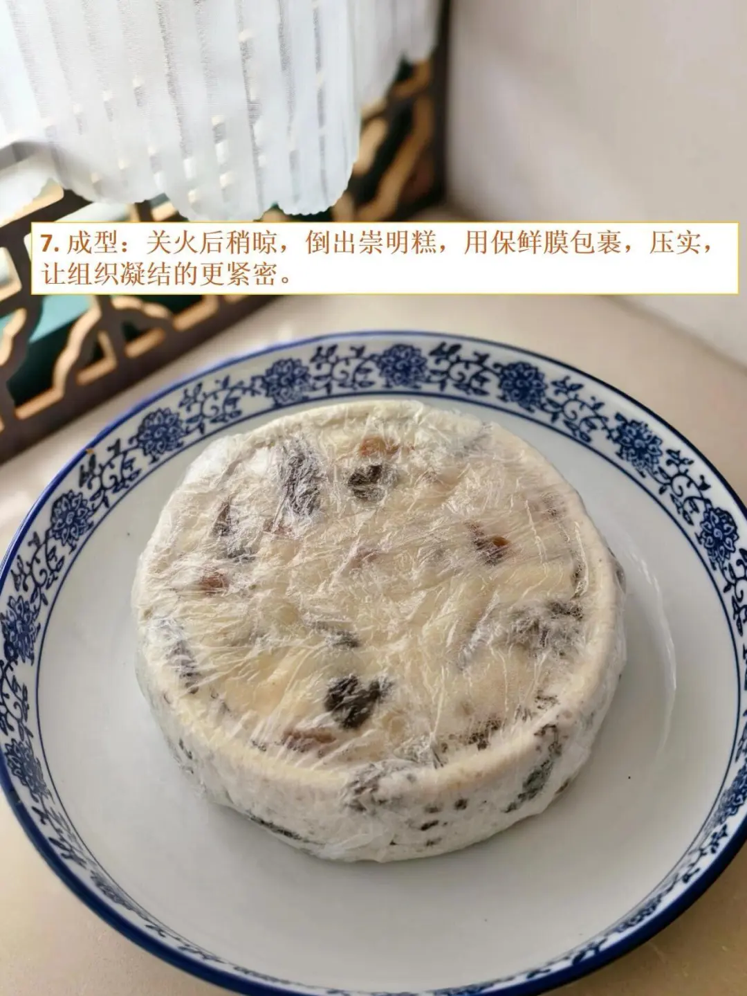 7. 成型:关火后稍晾,倒出崇明糕,用保鲜膜包裹,压实,让组织凝结的更紧密。