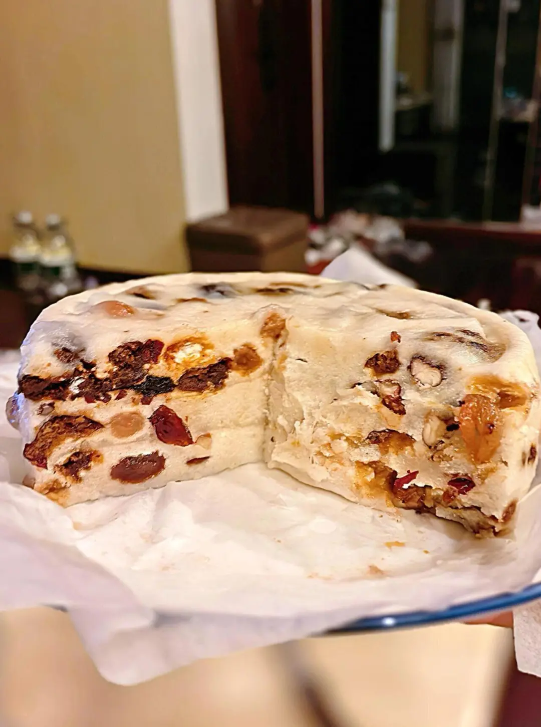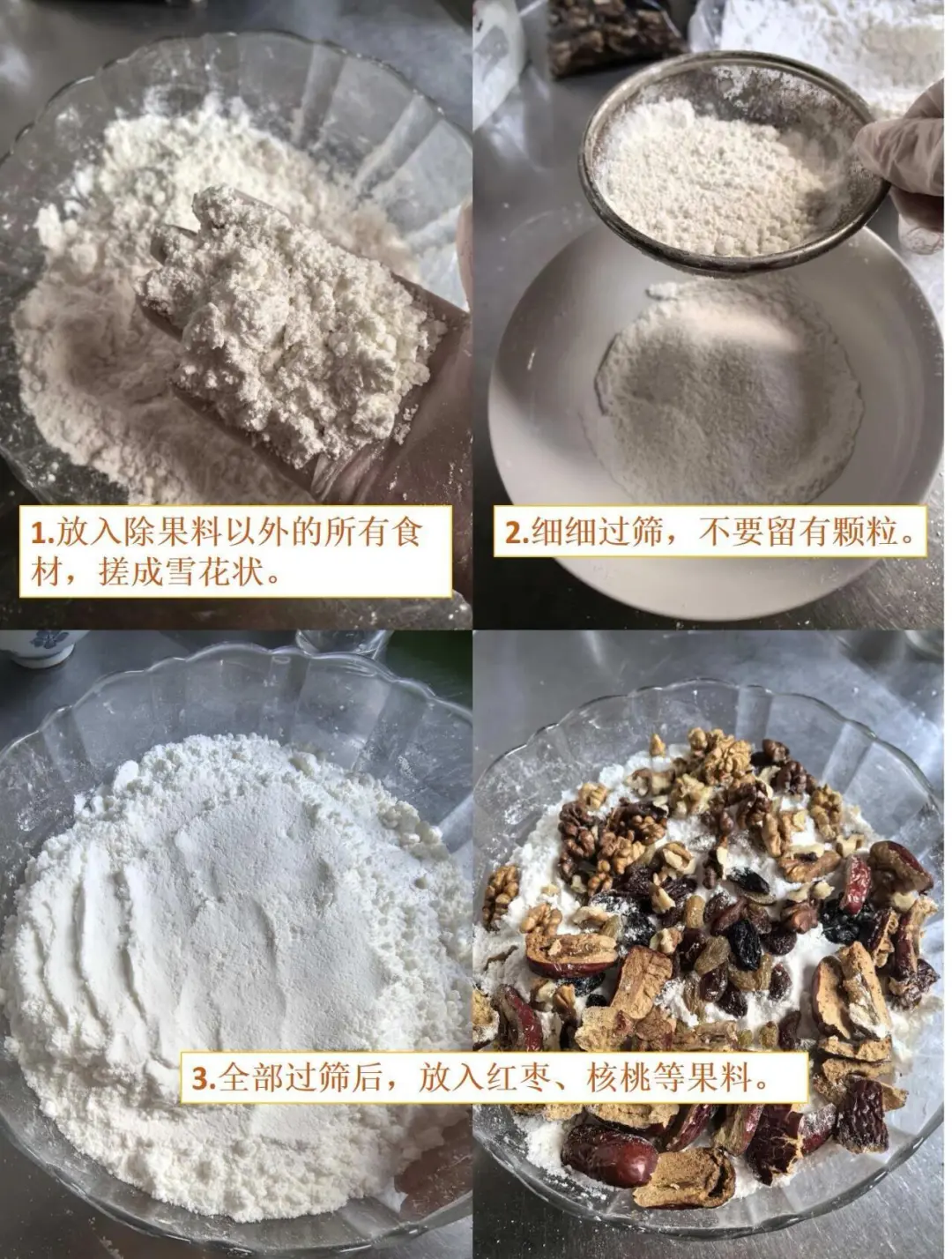 3. 全部过筛后,放入红枣、核桃等果料。