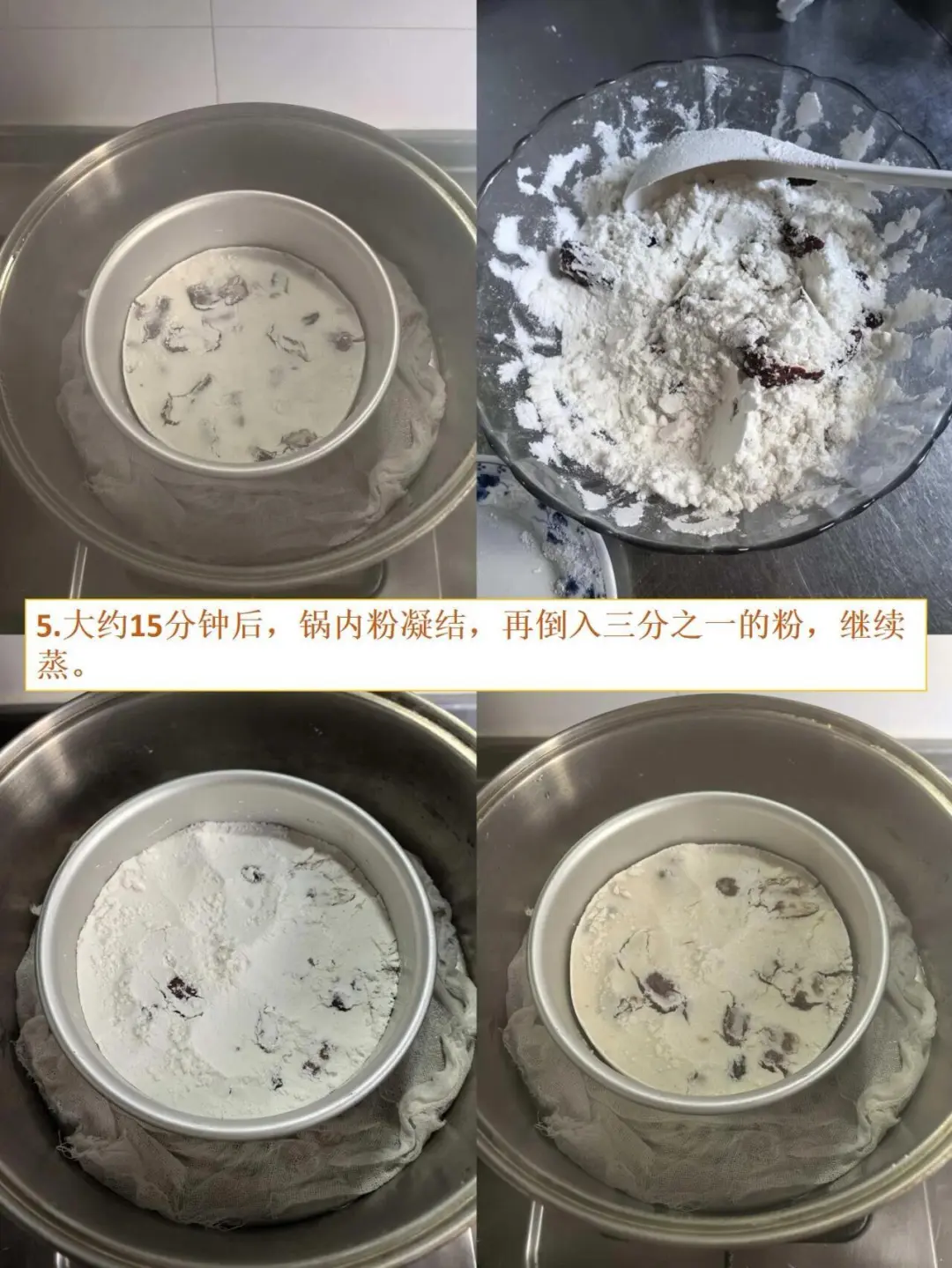 5. 大约15分钟后,锅内粉凝结,再倒入三分之一的粉,继续蒸。