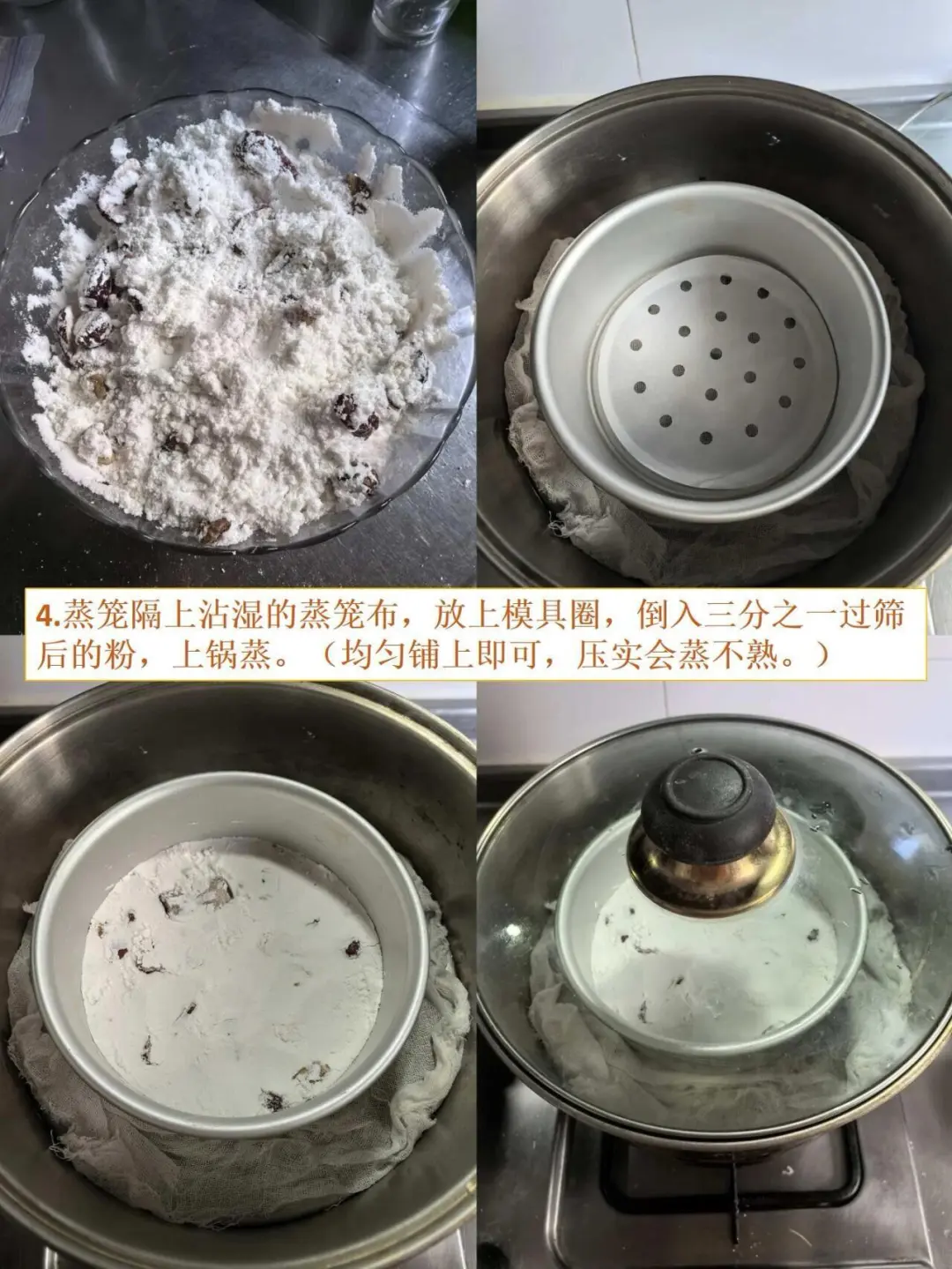 4. 蒸笼隔上沾湿的蒸笼布,放上模具圈,倒入三分之一过筛后的粉,上锅蒸。(均匀铺上即可,压实会蒸不熟。)