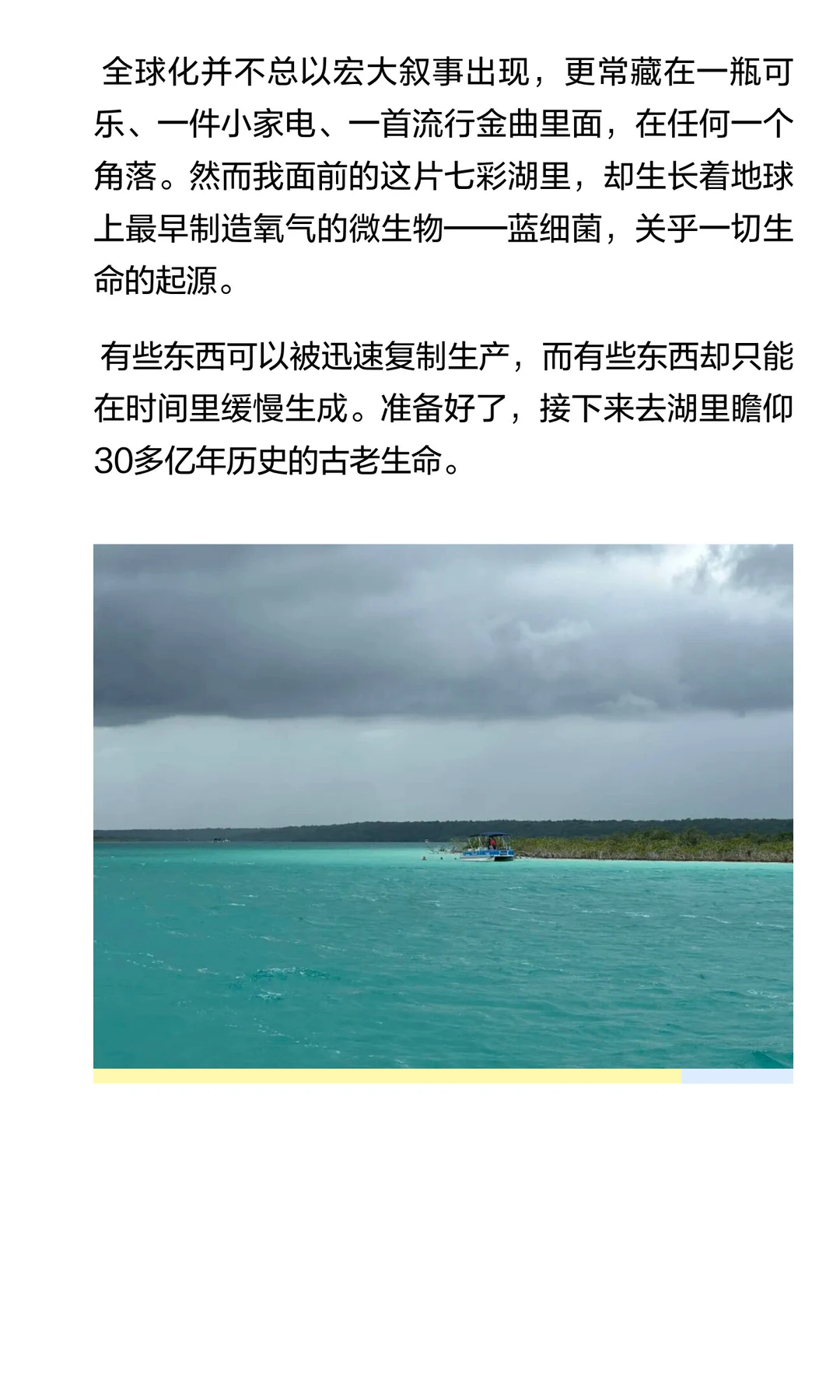 我面前的这片七彩湖里,却生长着地球上最早制造氧气的微生物——蓝细菌,关乎一切生命的起源。