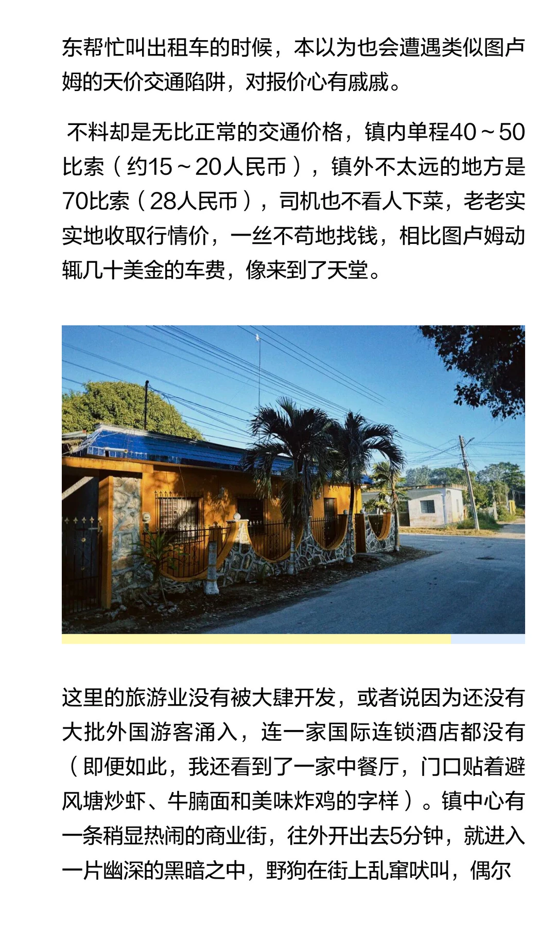 这里的旅游业没有被大肆开发,或者说因为还没有大批外国游客涌入,连一家国际连锁酒店都没有,自然也没有图卢姆那样的“天价交通陷井”。