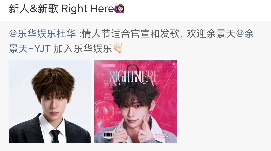 余景天官宣加入乐华余景天正式官宣加入乐华娱乐,新人身份重新出发,新歌《Right