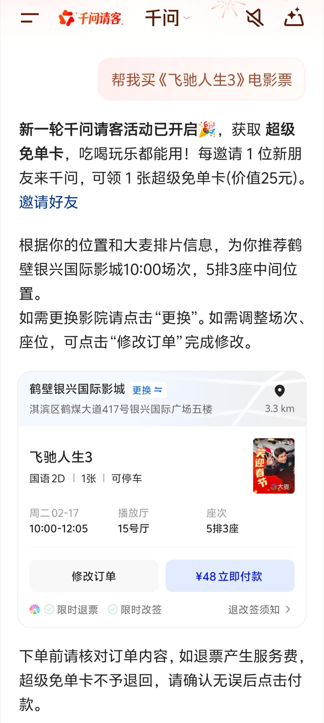 千问回应大免单再加3天千问免单卡再加三天千问这波操作也太顶了吧!免单卡居然又双叒叕升级了!已经不仅限于吃喝了,现在电影票、门票、机酒全能用,有效期直接拉到4月30日,听说后面还能打车、充话费和网购!我的第一波还没造完,第二波又给续上了,而且用途更全面了,这波操作我给满分。过年回村我要让所有人都知道!