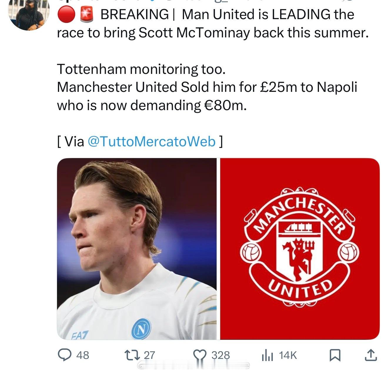回旋镖🪃这是哪里的媒体在报道?意大利?曼联领衔今夏引进麦克托米纳的竞争,曼联之前2500万英镑出售,现在那不勒斯为苏格兰人标价8000万欧元。热刺也在关注