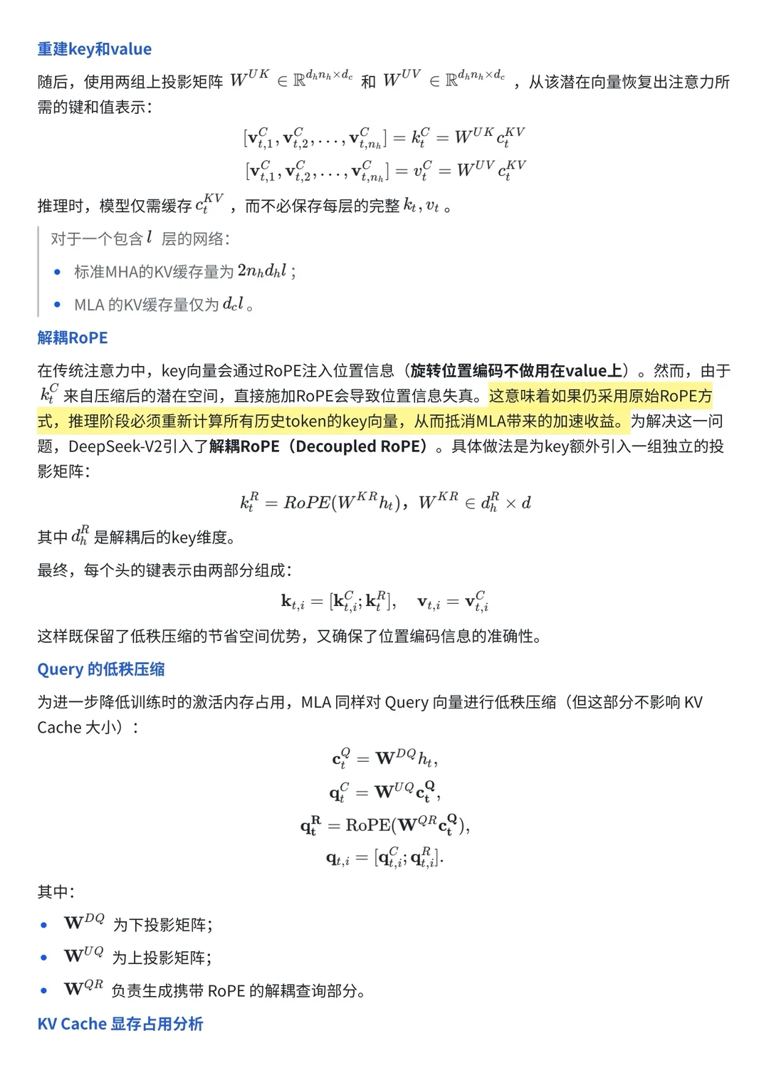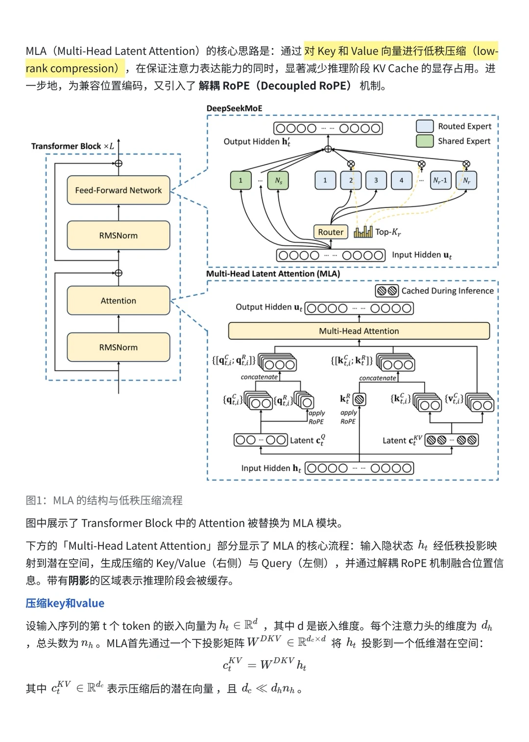 想要回答好这个问题及其追问,不仅要理解DSA是什么,还得清楚它要解决的MLA又是什么。接下来,本文将先回顾MLA的核心思想,再深入解读DeepSeek-V3.2-Exp的原文,这样我们才能知其然,更知其所以然。