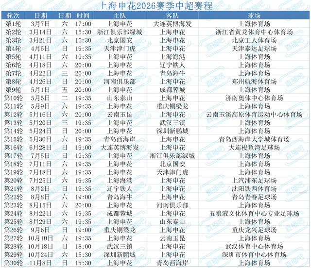 上海申花队中超赛程。
