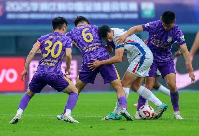新华社照片,天津,2025年11月22日11月22日,上海申花队球员高天意(右二)受到天津津门虎队多名球员防守。当日,在天津举行的2025赛季中国足球超级联赛第30轮比赛中,上海申花队客场3比1战胜天津津门虎队。新华社记者孙凡越摄