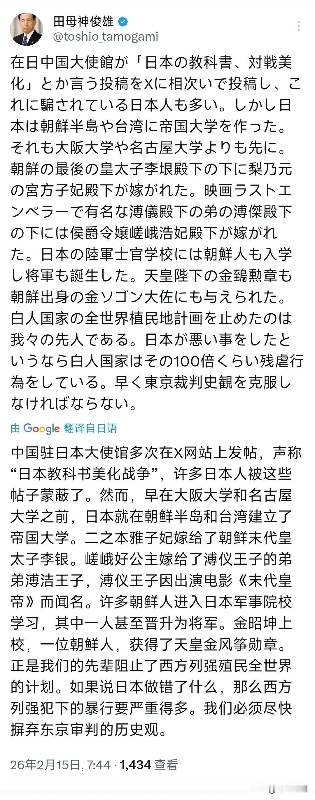 日本极右翼政客、前日本航空自卫队幕僚长田母神俊雄今天(2月15日)诡辩道:“中国驻日本大使馆在X上接连上传了‘日本教科书美化战争’之类的文章,被其欺骗的日本人也很多。但是日本在朝鲜半岛和台湾建立了帝国大学。而且比大阪大学和名古屋大学还要早。梨乃元的宫方子妃殿下嫁给了朝鲜末代皇太子李垠殿下。因电影‘末代皇帝’而闻名的溥仪殿下的弟弟溥杰殿下迎娶了侯爵千金嵯峨浩妃殿下。日本陆军士官学校也有朝鲜人入学,还诞生了将军。天皇陛下的金鵄勋章也授予了朝鲜出身的金素坤大佐。我们的祖先阻止了白人国家的全球殖民计划。如果说日本做了坏事,那么白人国家的暴行要比日本残忍100倍。必须尽快克服东京审判史观。” 评几句: 日本前自卫队高官田母神俊雄近期发表的言论,试图用个别事例美化殖民历史,不仅违背史实,更暴露了错误的历史认知,也伤害了曾遭受侵略的各国人民情感。 殖民与侵略给亚洲各国带来深重灾难,这是不容篡改的历史定论。把殖民统治下的个别安排包装成“善意举措”,刻意回避侵略本质,拿其他国家做挡箭牌推脱责任,在逻辑上完全站不住脚,也不可能得到国际社会认可。 二战后的国际秩序与历史裁决,是世界和平的重要基石,必须得到尊重。任何歪曲历史、美化侵略的言论,都不利于地区和平与互信。 以史为鉴才能面向未来,尊重历史才是正道。大家如何看待这种歪曲历史的言论?欢迎在评论区说说你的看法。