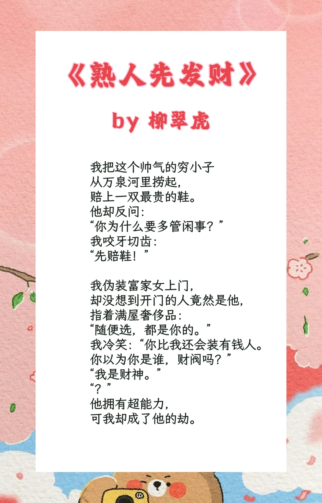 🌸姐妹们,最近又迷上了现言小说,翻到一本超好看的文,想跟大家分享一下[害羞R]书名是《熟人先发财》,打工人看到名字直接被吸引[暗中观察R]这本是熟男熟女➕都市奇幻的类型,作者真的太会写都市男女的拉扯感啦,看得一整个上头❗️