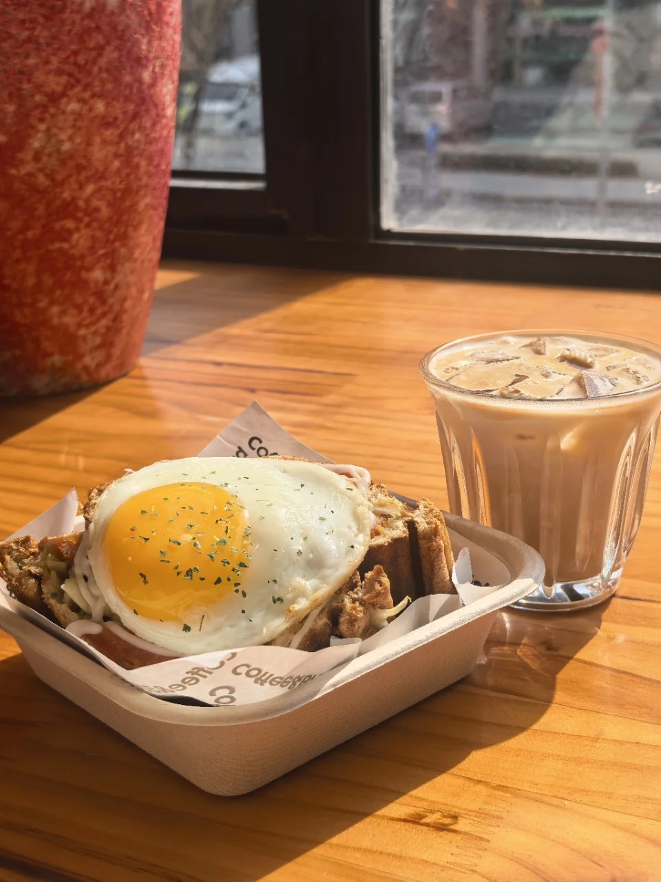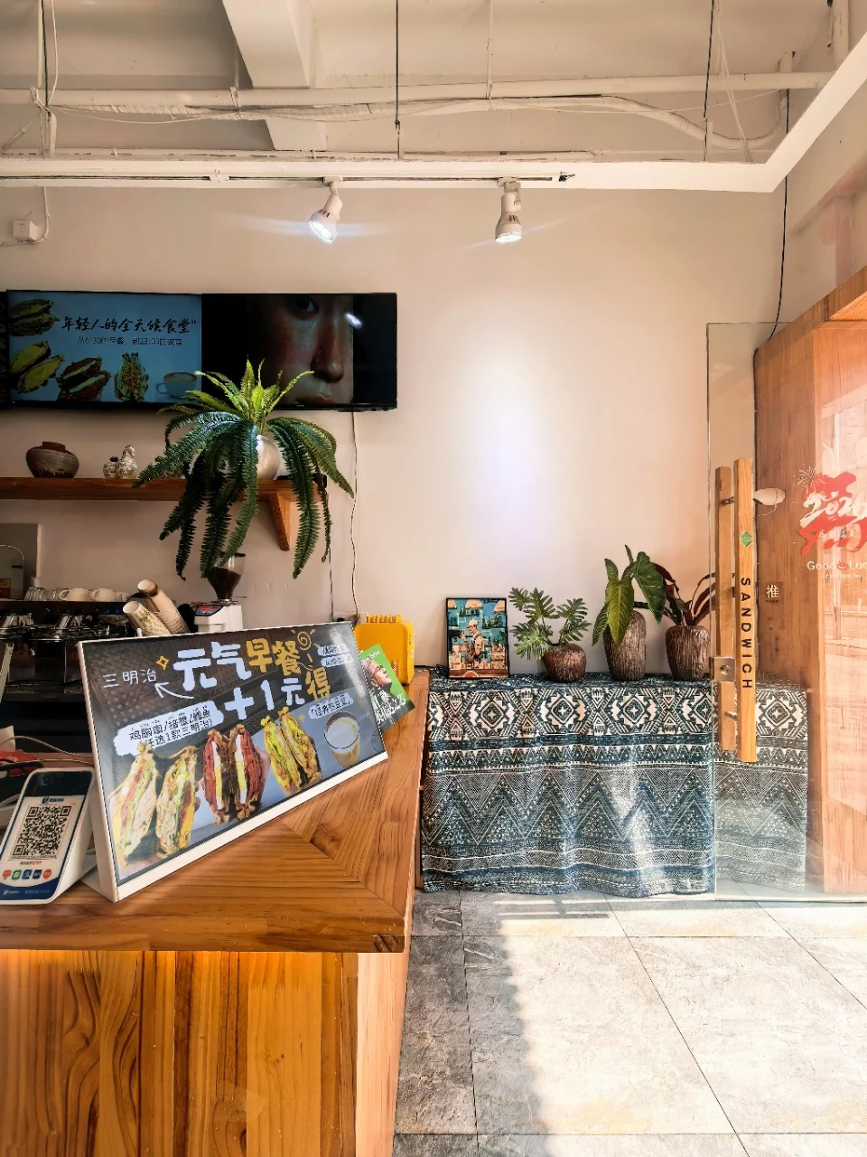 这家店在安吉开了好几年啦,以前常线上点单,现在还能堂食~二楼环境超舒服,很适合小坐休息~春节大鱼大肉吃腻了,就来侠宜,吃一份爆浆三明治吧🥰