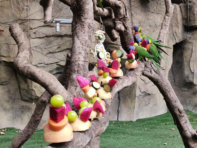 “看似奇怪,但又不能太怪,这样的丰容方式才能起到正向效果。”贾梦薇介绍,虽然“兔头”的造型让吸蜜鹦鹉感觉陌生,但所用蔬果都是它们平时的“饭菜”,这样能平衡陌生与熟悉的度,让小家伙们敢靠近尝试。