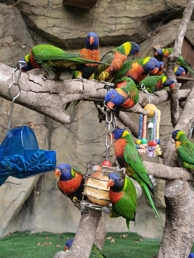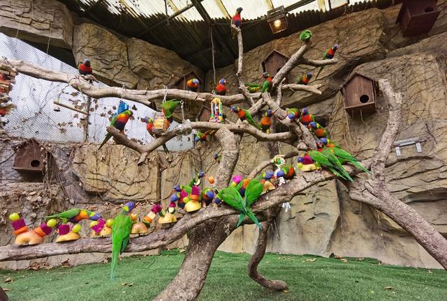 上百只来自大洋洲的吸蜜鹦鹉在高处的栖架上叽叽喳喳地“开会”,因为它们发现保育员贾梦薇最近把一些造型新颖的串串插到了它们的公用餐桌——三根枯木搭建的“H”型栖架上。